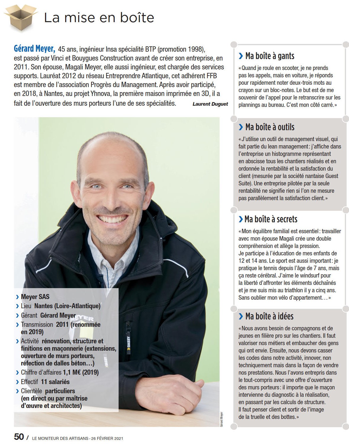 Ce portrait complet est dédié à Gérard Meyer, ingénieur INSA BTP. Il a fondé l’Entreprise Meyer en 2011. L’article précise que son épouse, Magali Meyer, est elle aussi ingénieure. Elle gère les services supports. De cette manière, elle contribue à l’équilibre familial et professionnel. L’activité principale de l’Entreprise Meyer couvre la rénovation, la structure et les finitions en maçonnerie. Surtout, l’entreprise propose une forte expertise dans l’ouverture des murs porteurs. De plus, le dirigeant insiste sur la nécessité d’innover dans la manière de vendre les prestations. De même, l’article met en avant la mesure conjointe de la rentabilité et de la satisfaction client pour piloter l’entreprise.