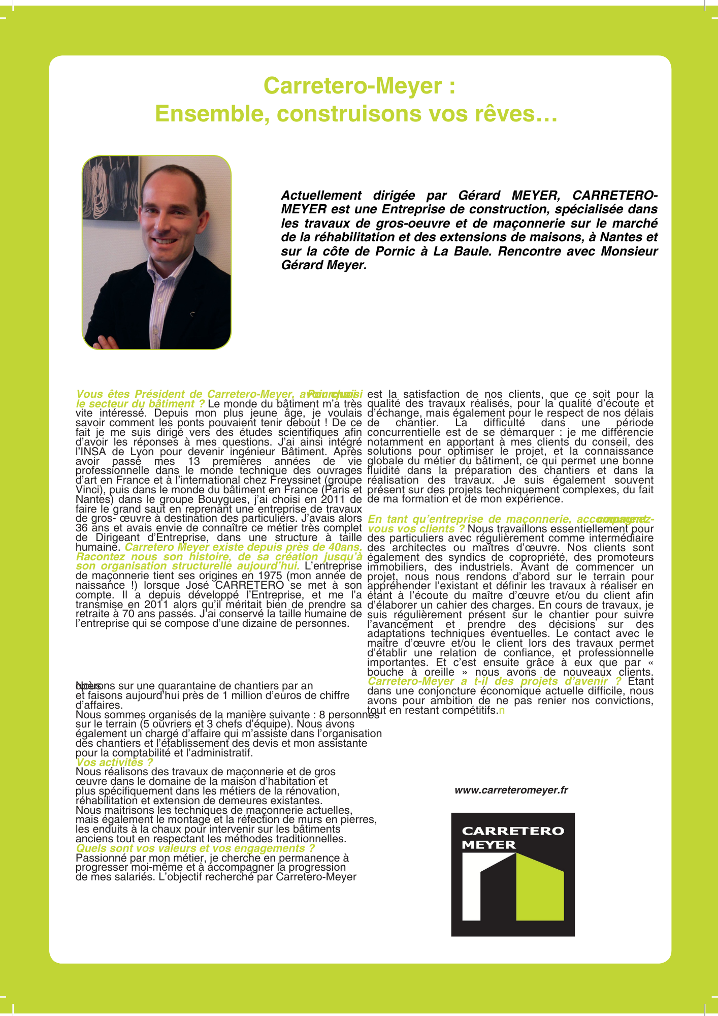 Retrouvez l’intégralité des articles de presse qui mettent en lumière le savoir-faire et l’engagement de l’Entreprise Meyer. Le dirigeant, Gérard Meyer, est Ingénieur Bâtiment diplômé de l’INSA de Lyon. En effet, après avoir acquis de l’expérience dans de grands groupes de construction comme Vinci et Bouygues, il a repris l’entreprise Carretero en 2011. Aujourd’hui, l’Entreprise Meyer se spécialise dans la rénovation, la réhabilitation et les extensions de maisons. De plus, elle possède une expertise reconnue en ouverture de murs porteurs. L’entreprise se distingue ainsi par son approche technique et privilégie la satisfaction client. Enfin, elle affiche une volonté constante d’innover. Ces articles confirment la reconnaissance de son expertise en maçonnerie et gros œuvre en Loire-Atlantique.